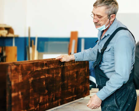 A gray-haired carpenter with glasses works with wood on a workbench in a carpentry shop. A pensioner in a medical mask at work. Employment and labor an elderly man in work clothes