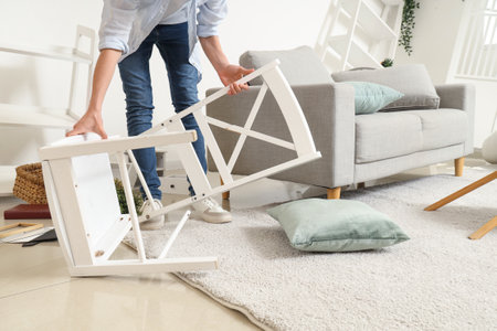 person, arranging and rearranging various items of traditional furniture in room, created with generative ai