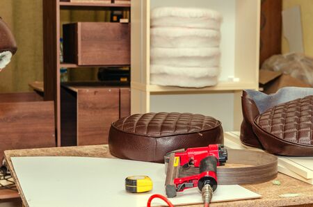 Seat upholstery in a furniture workshop, eco-leather cover, close-up