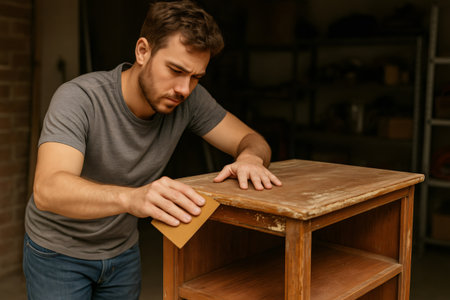 Carpenter carefully sanding old wooden cabinet in his workshop, preparing it for upcycling and restoration project