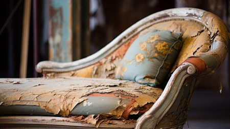 a chair covered in peeling paint is being ripped up from the ground, showcasing a unique blend of luxurious fabrics and manapunk style. the soft-focus image captures the chair's intricate details, with a color palette of light teal, amber, light indigo, and dark beige. this captivating photo on flickr highlights the juxtaposition of opulent drapery and a distressed aesthetic. ai generated