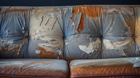 a dirty couch with peeling brown paint, showcasing a unique combination of dark gray and light aquamarine colors. the eroded interiors add character to the piece, while the explosive pigmentation creates a captivating visual effect. the reflective surface highlights the contrasting shades of light orange and navy, giving the couch a distinct leatherhide appearance. this photo was captured using a nikon d750. ai generated