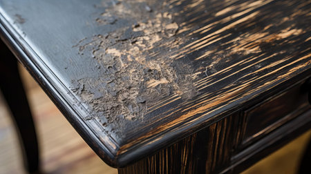 a captivating close-up of a vintage spandex end table, highlighting its unique imperfections, with visible grain, cracks, and peeling paint revealing its rich history. ai generated