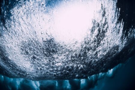 Breaking wave with foam and bubbles underwater. Transparent ocean water