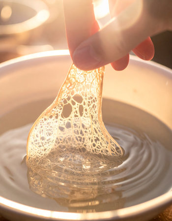 In a sunlit workshop, a creator's hand gently dips a complex, cellular structure into a basin of liquid clay.