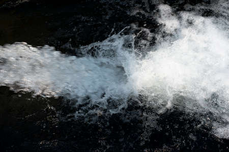Dynamic swirling water capturing motion, with frothy splashes and shimmering bubbles amid a lush, natural riverbank backdrop.