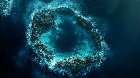 Aerial view of swirling ocean vortex with powerful waves dynamic aquatic movement and energy.