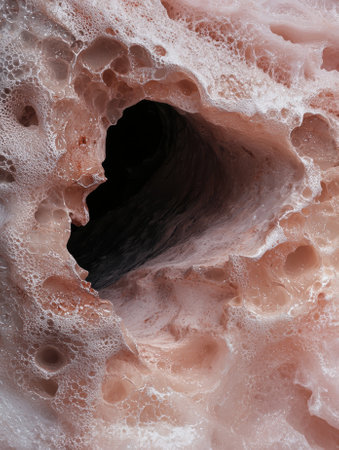 A captivating view through jagged rocks reveals a swirling vortex of turquoise ocean water, creating a dynamic and powerful scene of nature's raw energy.