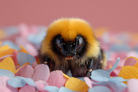 A high-resolution macro photograph showcasing the intricate details of a bumblebee resting on a bed of pastel-colored petals. the vibrant colors and sharp details highlight the beauty and importance of pollinators in nature. Generative AI