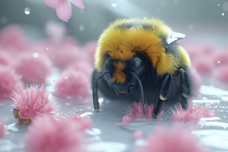 Close-up macro shot of a bumblebee resting on vibrant dewy pink blossoms, the intricate details of the bee and the delicate flowers. the serene scene signifies spring and the synchronization of wildlife with blooming flora. Generative AI