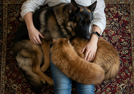 A person is gently petting a fluffy cat and German Shepherd dog lying together on a richly patterned, vintage rug. Generative Ai