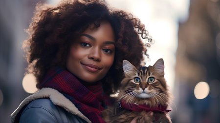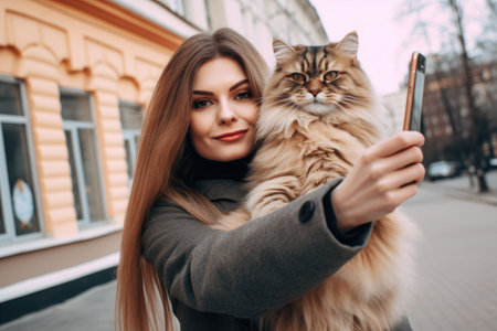 woman holding her cat in her arms while taking a selfie, created with generative ai
