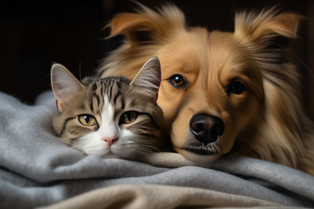 Adorable cat and dog lying under plaid on floor. Warm and cozy winter. High quality photo