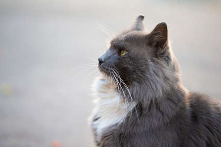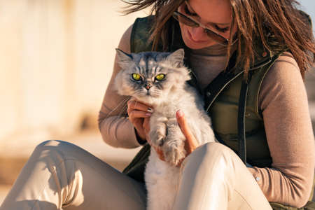 Stylish lady with her beautiful grey groomed persian chinchilla purebred cat sitting outside on the sunset. Pet with owner photography