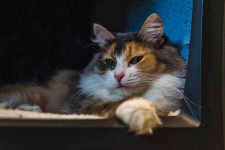 Close-up of cute maine coon cat sunbathing in the apartment.