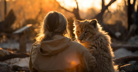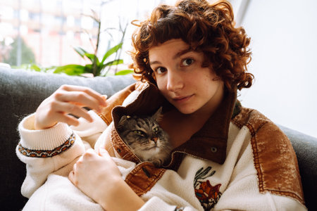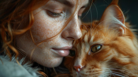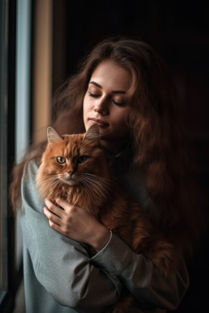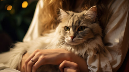 A young woman cuddling fluffy tabby cat in cozy embrace with warm bokeh lights and affectionate mood