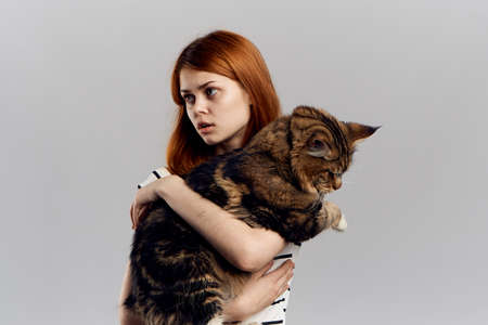 Young beautiful woman on white isolated background holds a cat, maine coon, pets.