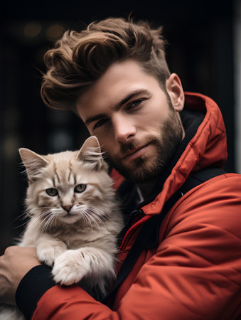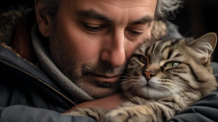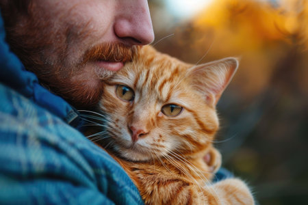 man affectionately holding a ginger cat close, showcasing a serene and tender moment together