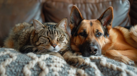 The dog and the cat are lying on the couch together. Pets are relaxing on the couch at home.
