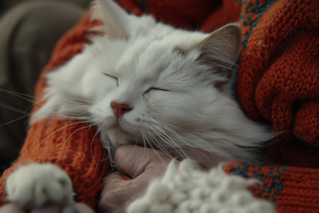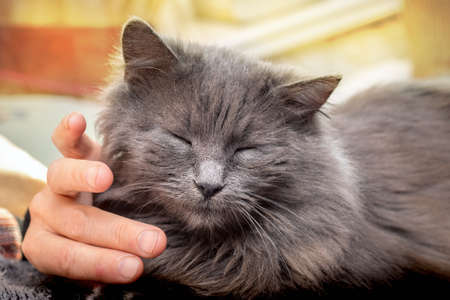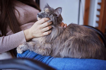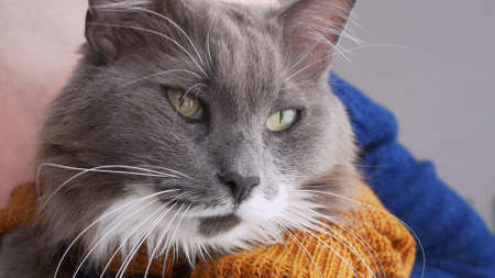 Close-up of a cute gray cat with fluffy fur in the arms of his owner. Favorite pets live with people for many years. Cat in a suit in the form of a knitted suit.
