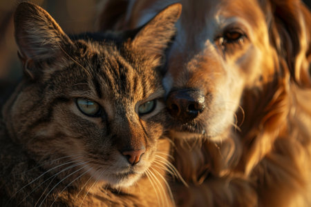 Happy domestic dog and tabby cat sit side by side in green grass, enjoying warm sunshine and peaceful companionship outdoors, conveying trust, affection, and harmony