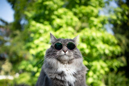 cute blue tabby white maine coon cat wearing glasses outdoors looking funny