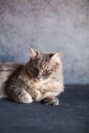 beautiful cute fluffy woolly shaggy striped gray domestic cat with yellow eyes sitting on dark background. Image for veterinary clinics, sites about cats. Selective focus. Space for text.