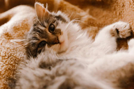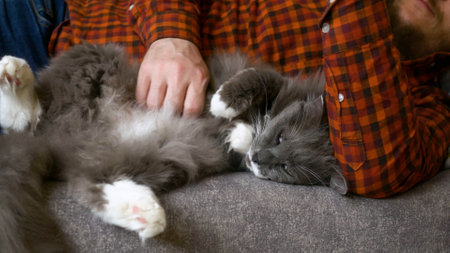 Cute two-tone gray kitten with white spots on its tummy and paws lies next to man who strokes a fluffy cat belly. A man scratches and strokes the cats belly. The cat enjoys the caresses of the owner.