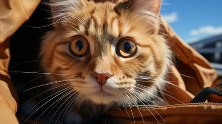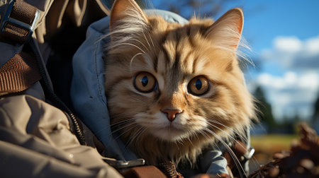 Hand petting lovely cute and friendly cat in backpack carrier. Pets and human friendship, trust and love. Animal lovers. Travel with cat.