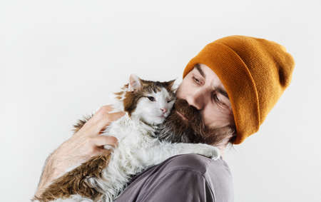 Cat in the arms of the owner. A white-gray cat is resting in the arms of a man. Emotions of love, tenderness, care