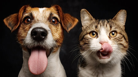 Dog and cat close up portrait showing a friendly interaction between pets, with the dog panting eagerly and the tabby cat licking its lips on a dark background