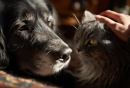 A tender close-up captures a loyal dog and curious cat gently nestled side by side, radiating warmth, trust, and lifelong friendship.