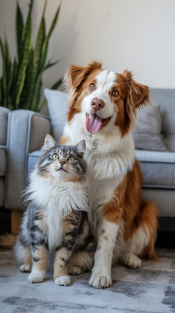 Australian shepherd dog and cat together at home. Pet and animal concept
