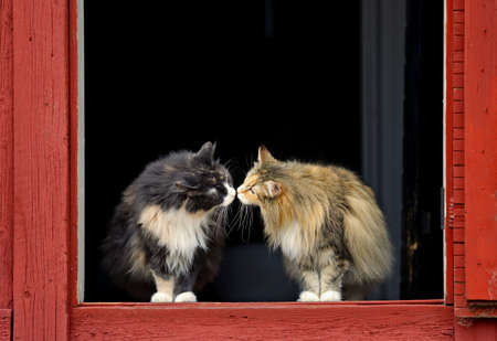 Two norwegian forest cat females smelling each others nose on a doorstep