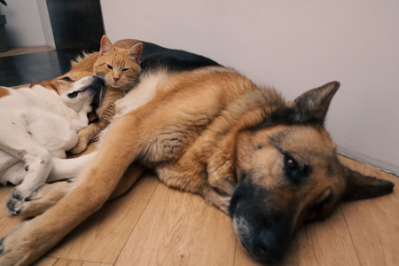 A German Shepherd, a Beagle mix, and a red tabby cat resting peacefully together on a wooden floor. Concept of animal friendship, multi-pet household, and peaceful co-existence.