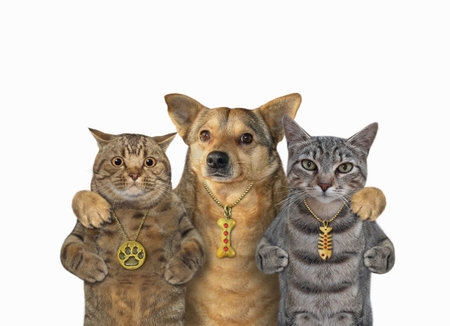 A beige dog hugs two cats. White background. Isolated.