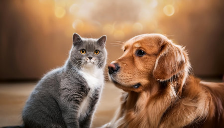 This image captures a friendly golden retriever and a gray and white cat indoors, both peacefully posed next to each other, with a charming backdrop of warm bokeh lights creating a comforting atmosphere. AI generated image