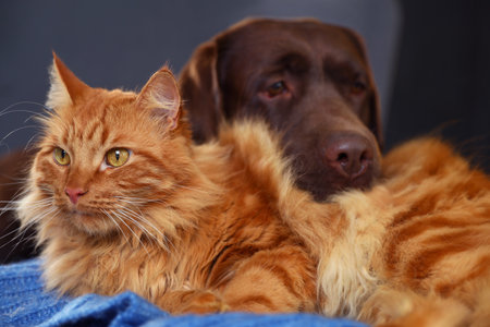 A peaceful moment captures a feline and a retriever sharing cozy warmth on a plush gray sofa, radiating comfort and companionship.