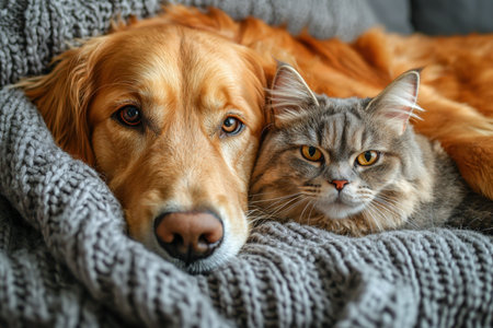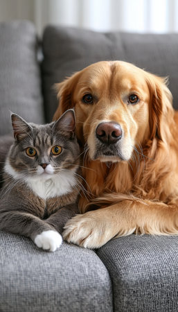 A serene scene featuring a gray feline and a golden retriever curled up in harmony on a cozy sofa, radiating peaceful companionship.
