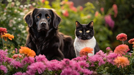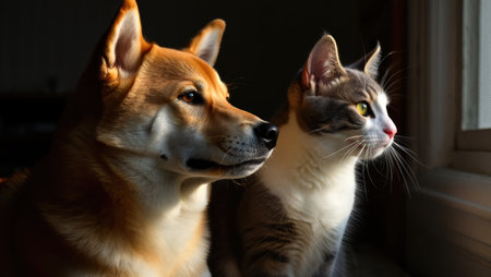 Two animals, a dog and a cat, are sitting side by side on a windowsill. They gaze outside, illuminated by the warm sunlight of late afternoon. Their expressions show curiosity and calmness.