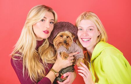 Blonde girls adore little cute dog. Women hug yorkshire terrier. Cute pet dog. Yorkshire terrier is very affectionate loving dog that craves attention. Yorkshire Terrier breed loves socialization