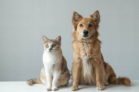 Cute cat and dog together on white table on grey background.