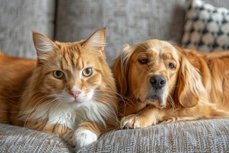 Orange Cat and Golden Retriever Resting Together on Gray Couch, Cozy Pet Companionship
