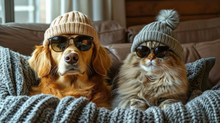 Close-up portrait of a cat and dog in colorful knitted hats and sweaters, showing cozy winter friendship and charm.