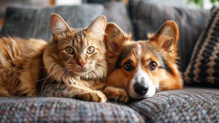 A serene scene featuring a gray feline and a golden retriever curled up in harmony on a cozy sofa, radiating peaceful companionship.
