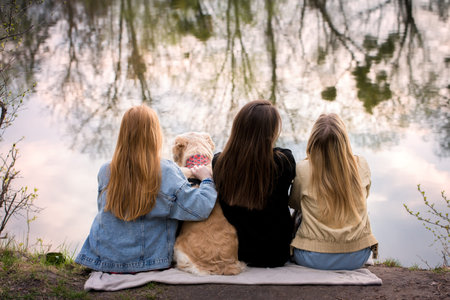 Three girls relaxing by the river with a dog