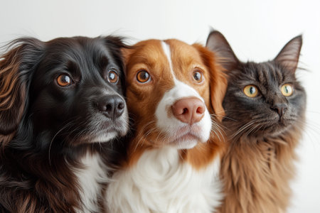 Assorted cats and dogs in studio with white background for versatile design projects and copy space