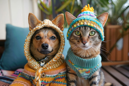 Dog and cat wearing knitted clothes posing together