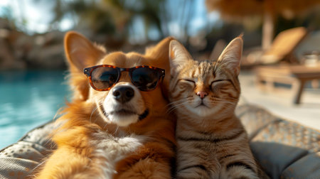 Cute red cat and dog in sunglasses lying near swimming pool.