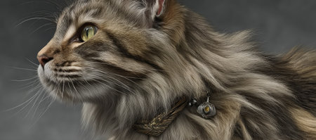 A side profile of a cat is displayed, showcasing detailed fur texture and patterns. The image features neutral tones, with shades of brown, gray, and yellow in the eyes, against a blurred gray backdrop. It is suitable for various uses, including advertising and editorial projects.